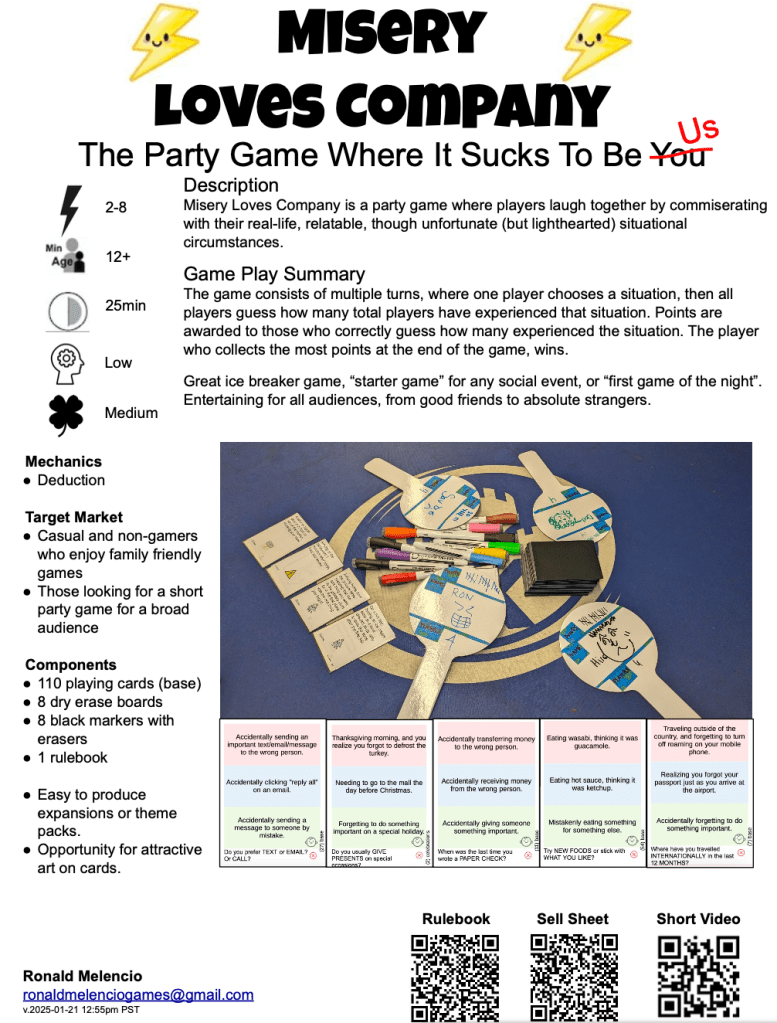 Ronald Melencio wanted to try making a silly party game rooted in real and relatable circumstances. By coming up with a party game that plays in less than 30 min, Ronald was able to bring different audiences together to play and share a fun experience.